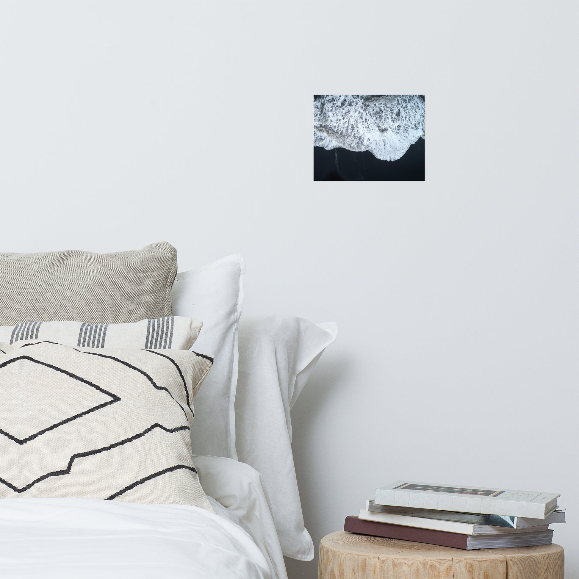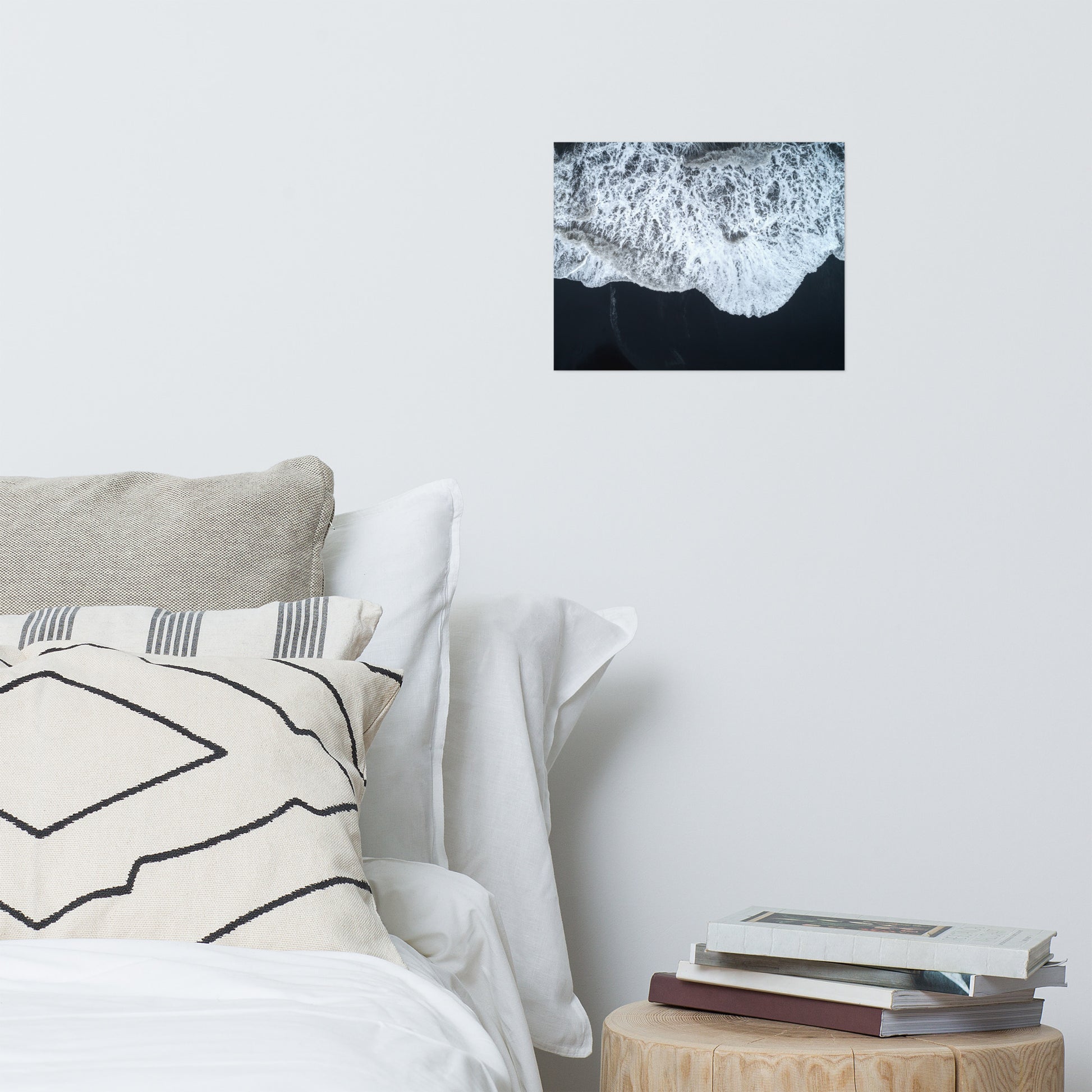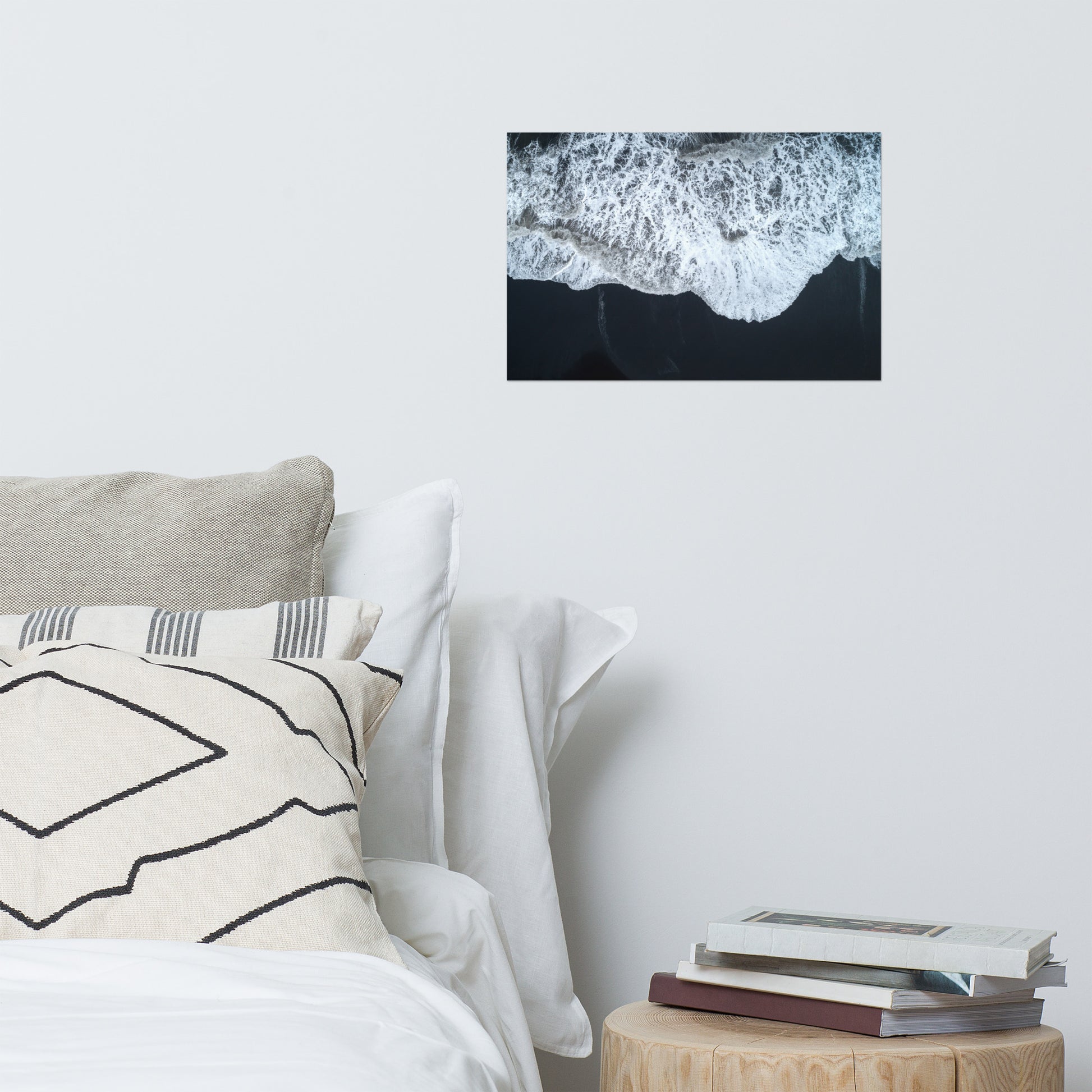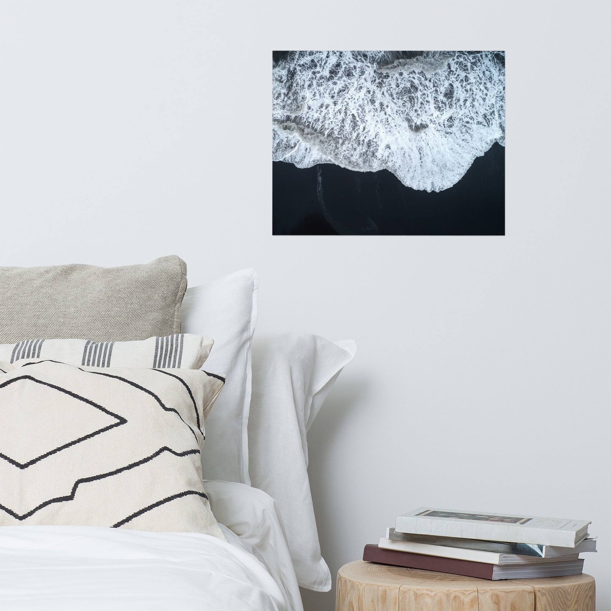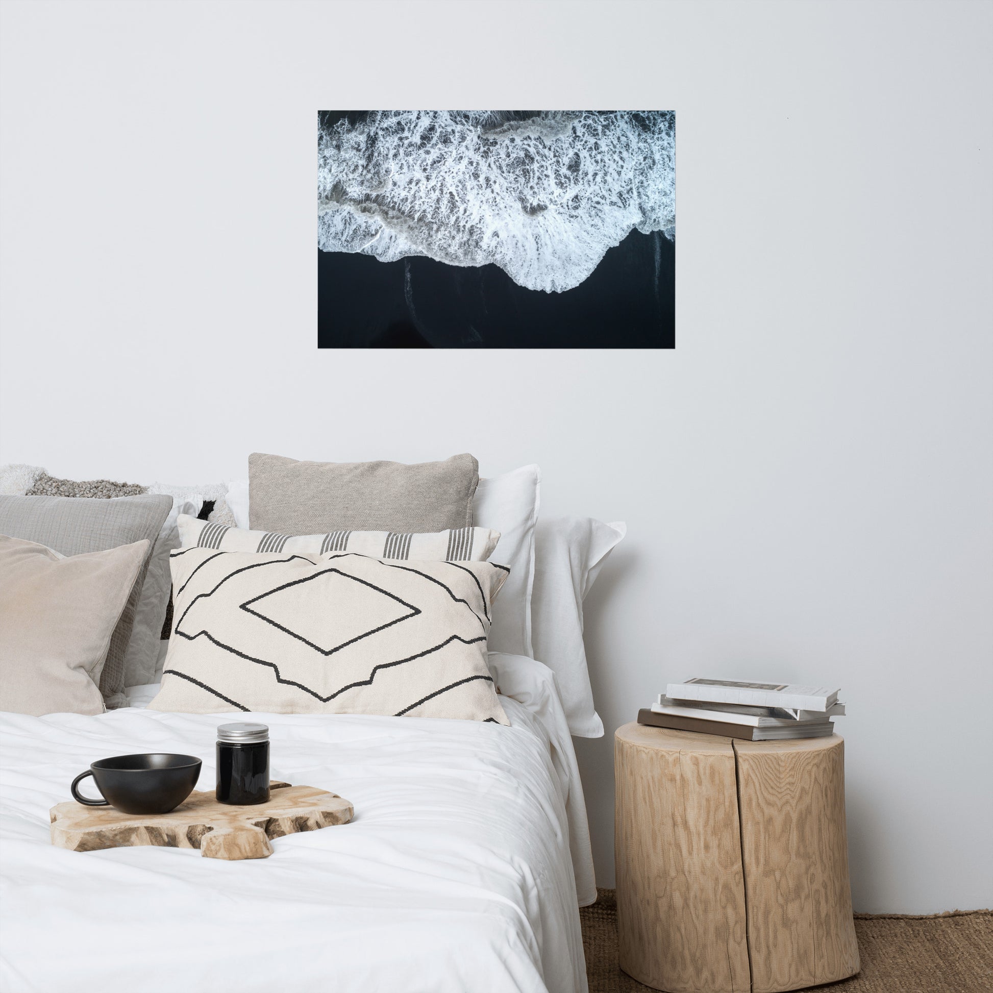About this modern coastal prints: Embrace the dramatic allure of Iceland's black volcanic sands and the mesmerizing dance of white waves with this modern coastal print. The high-contrast, minimalist aerial landscape captures the raw beauty of nature's meeting point, making a bold statement in any space. Unframed and ready for your personal touch, this unique artwork invites you to bring a touch of the wild Icelandic coast into your home.