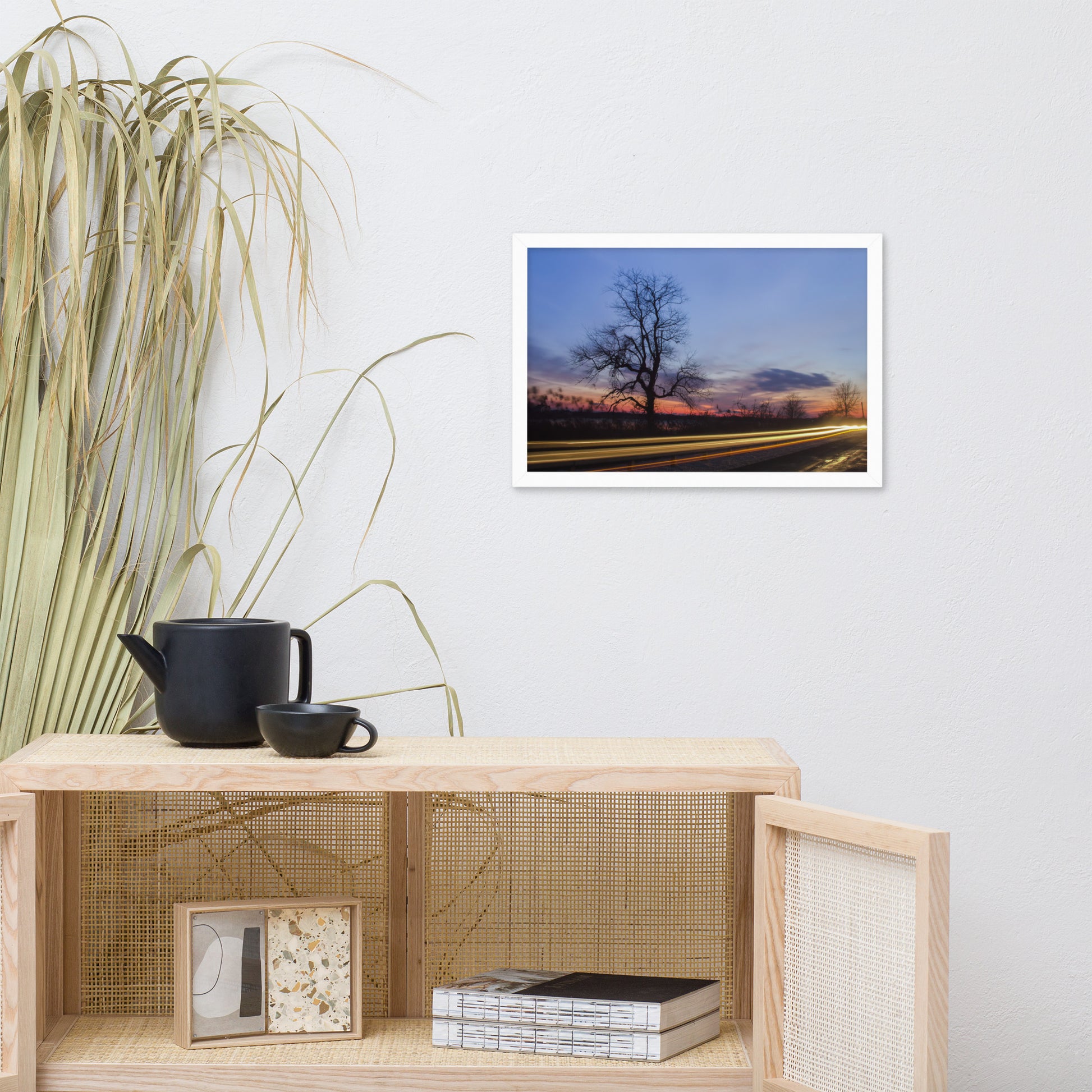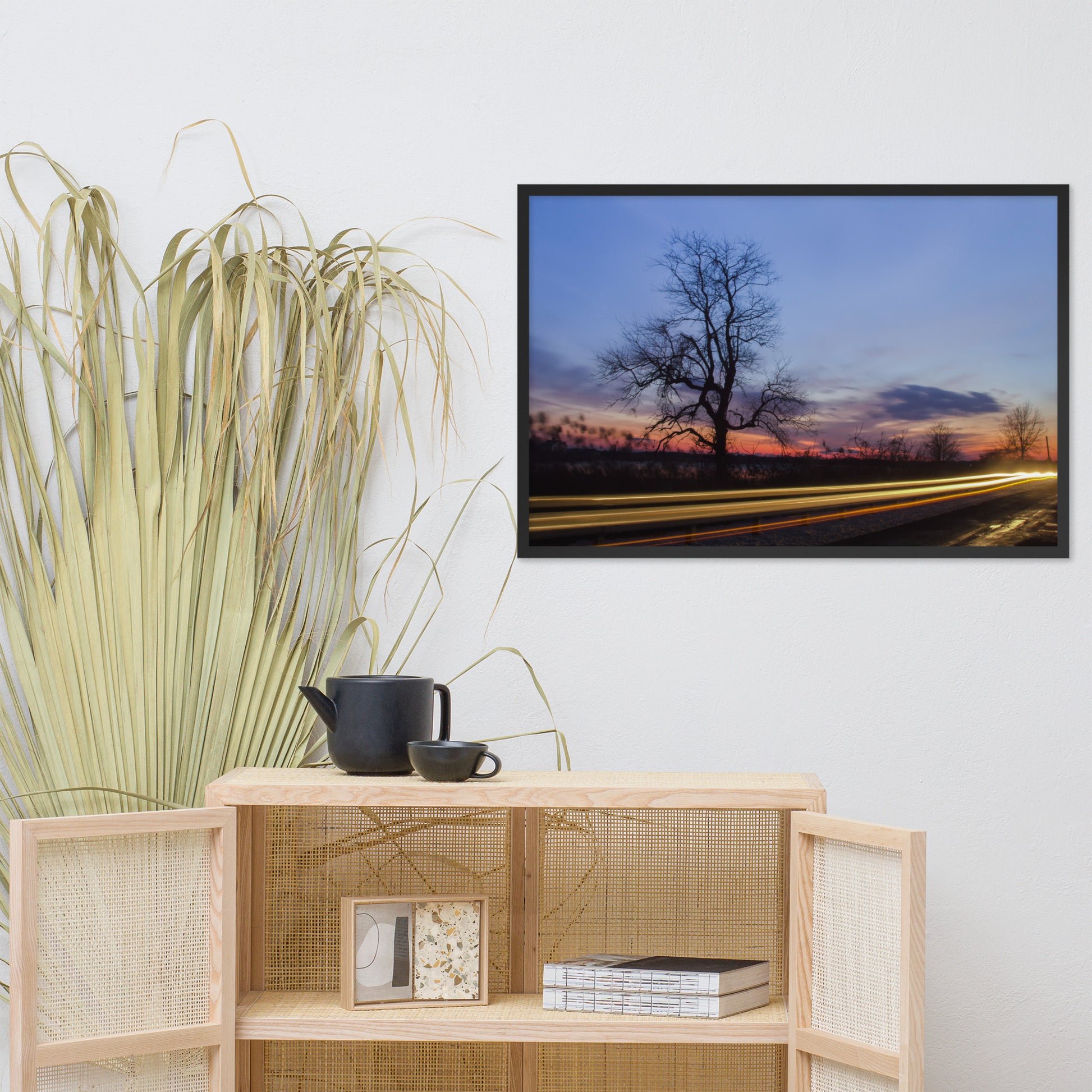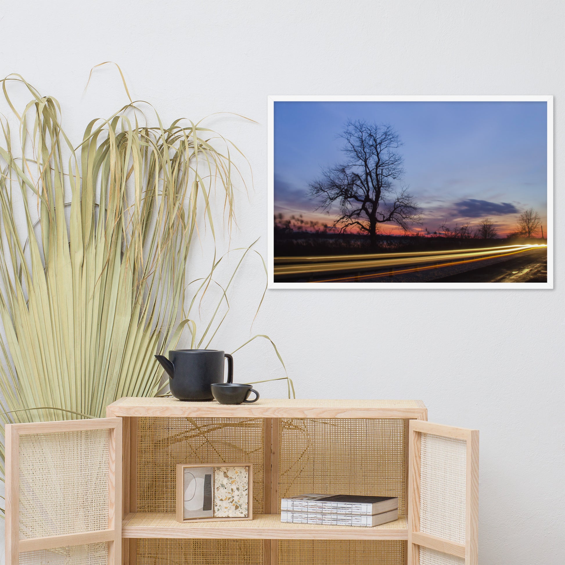 About This Rustic Scene: Embrace the mystique of "Wicked Tree," a captivating photograph that captures the haunting beauty of a solitary tree silhouetted against a vibrant twilight sky. The gnarled branches reach towards the heavens, as if yearning for something beyond the earthly realm. The streaks of light from passing cars paint a scene of movement and energy, contrasting with the stillness of the landscape.