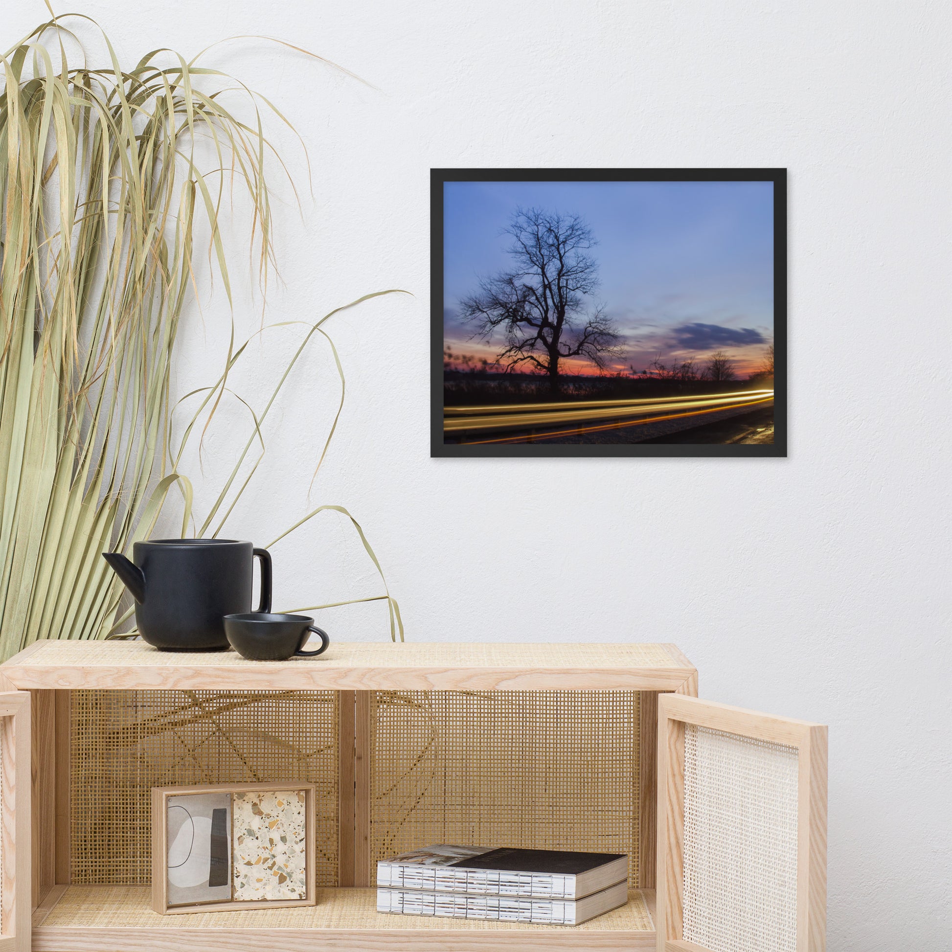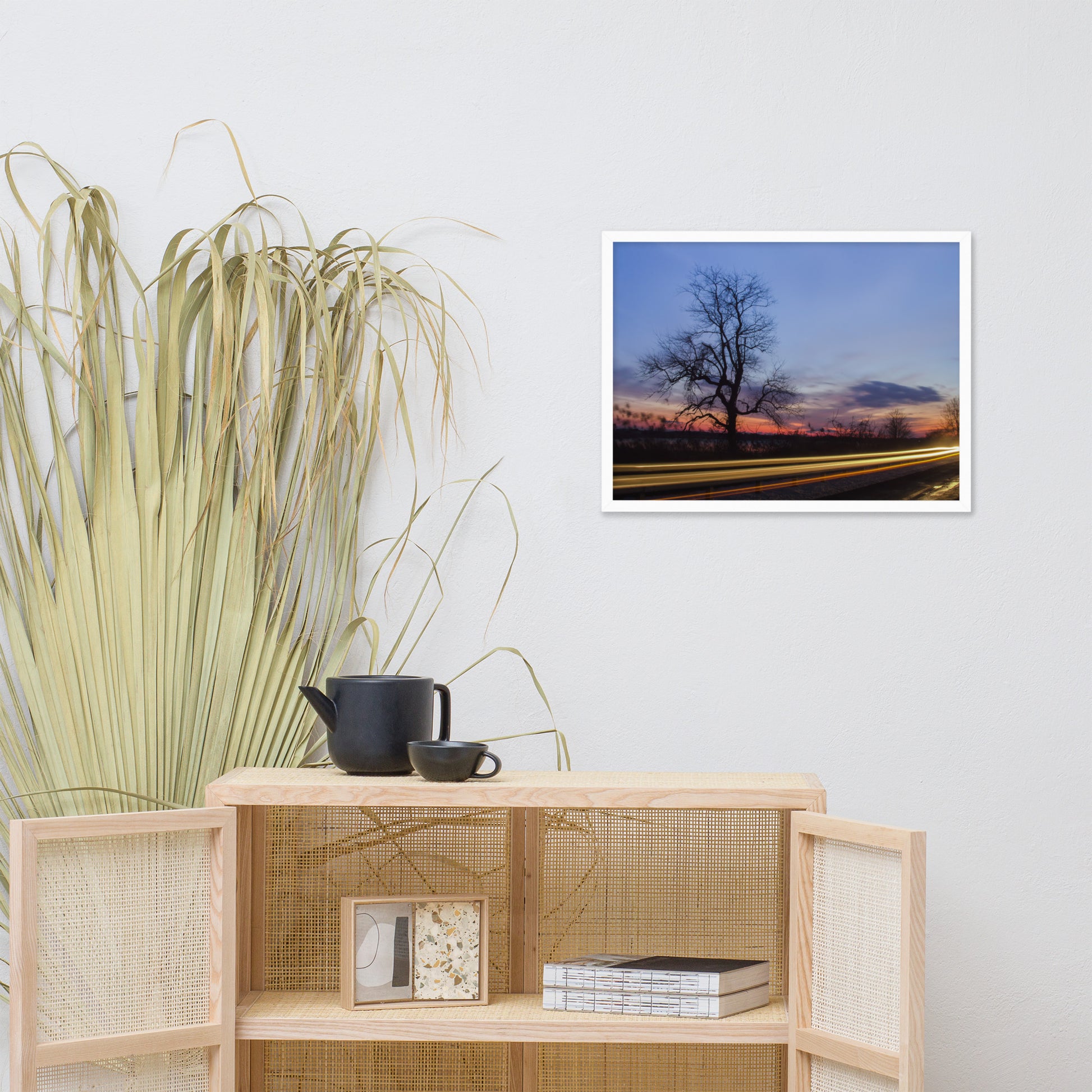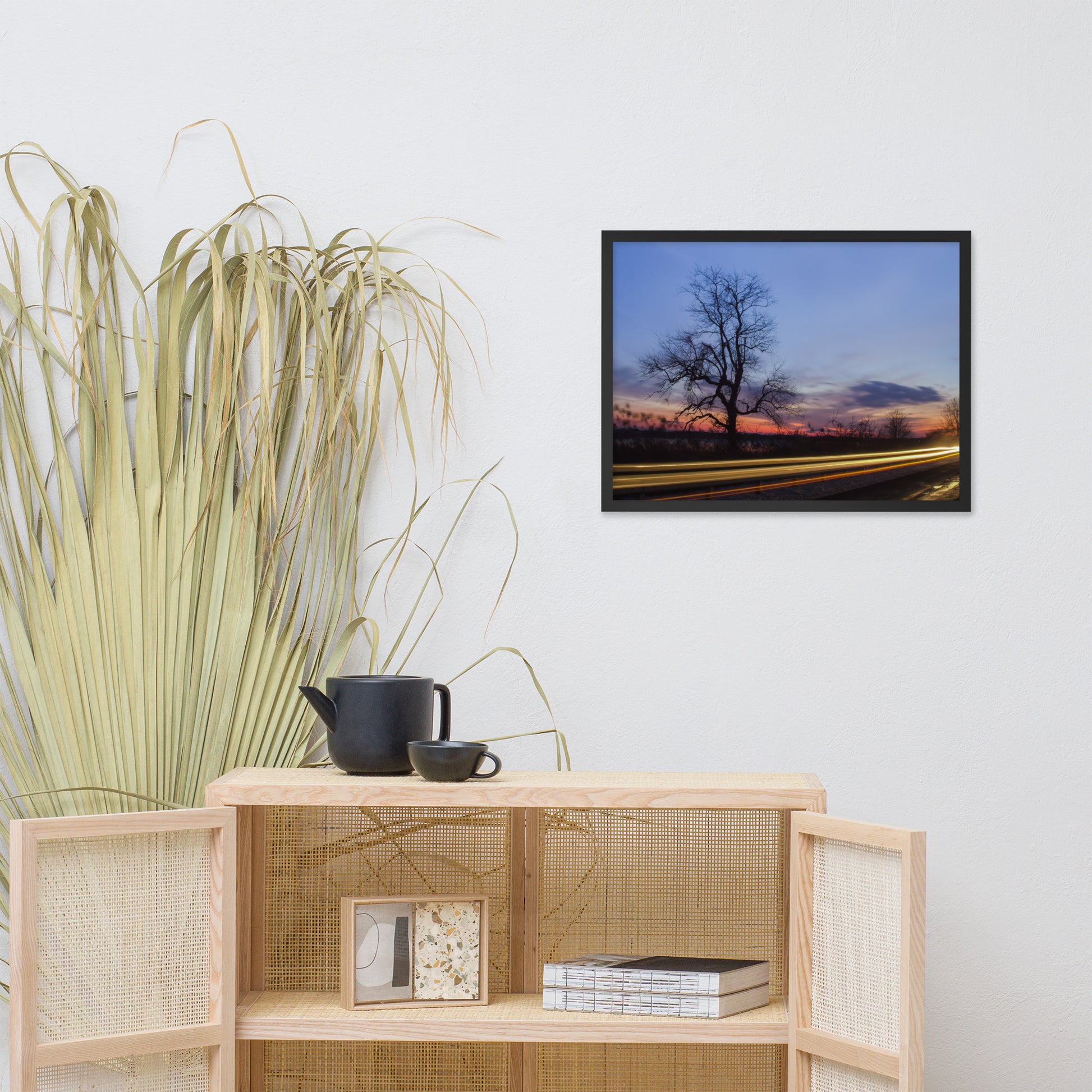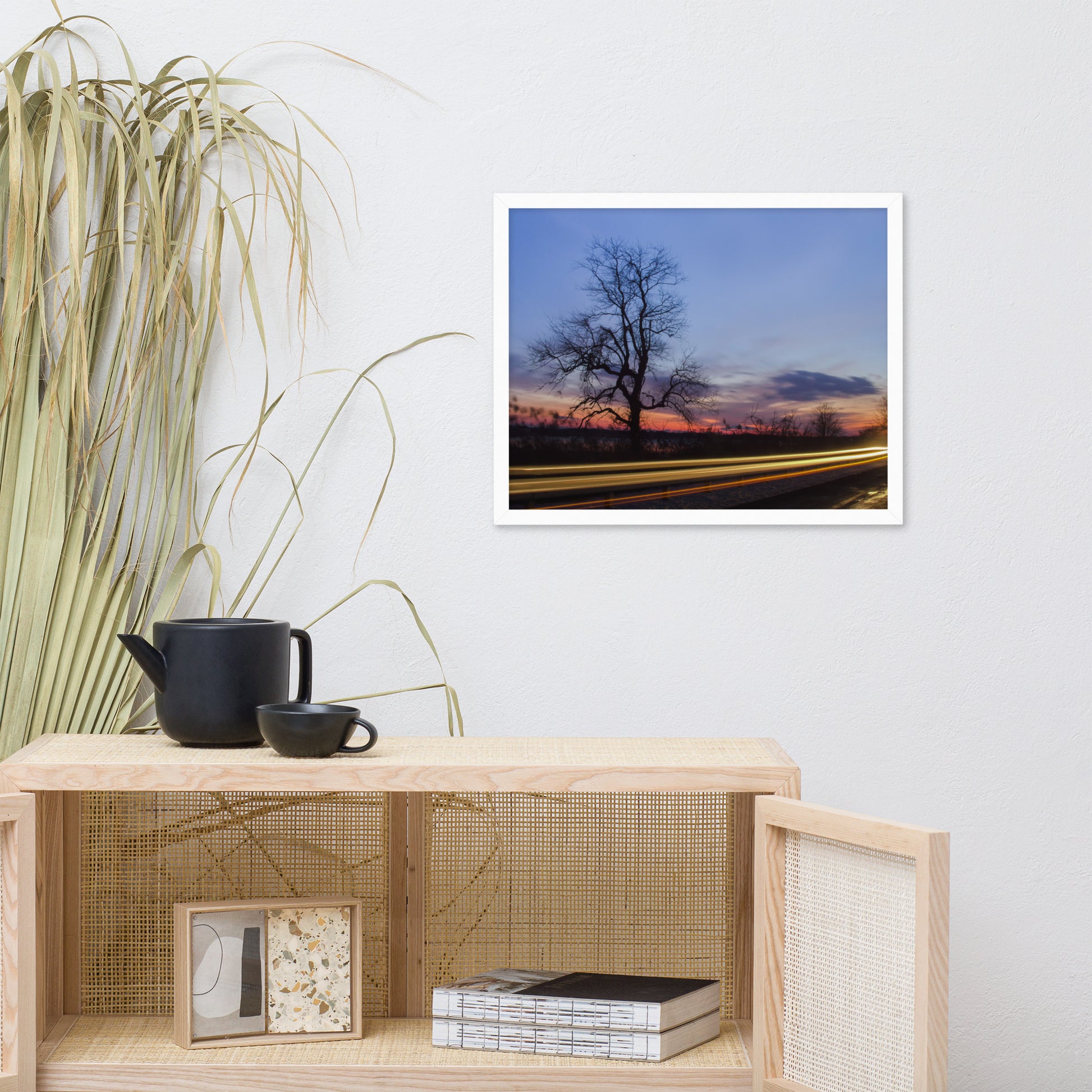 About This Rustic Scene: Embrace the mystique of "Wicked Tree," a captivating photograph that captures the haunting beauty of a solitary tree silhouetted against a vibrant twilight sky. The gnarled branches reach towards the heavens, as if yearning for something beyond the earthly realm. The streaks of light from passing cars paint a scene of movement and energy, contrasting with the stillness of the landscape.