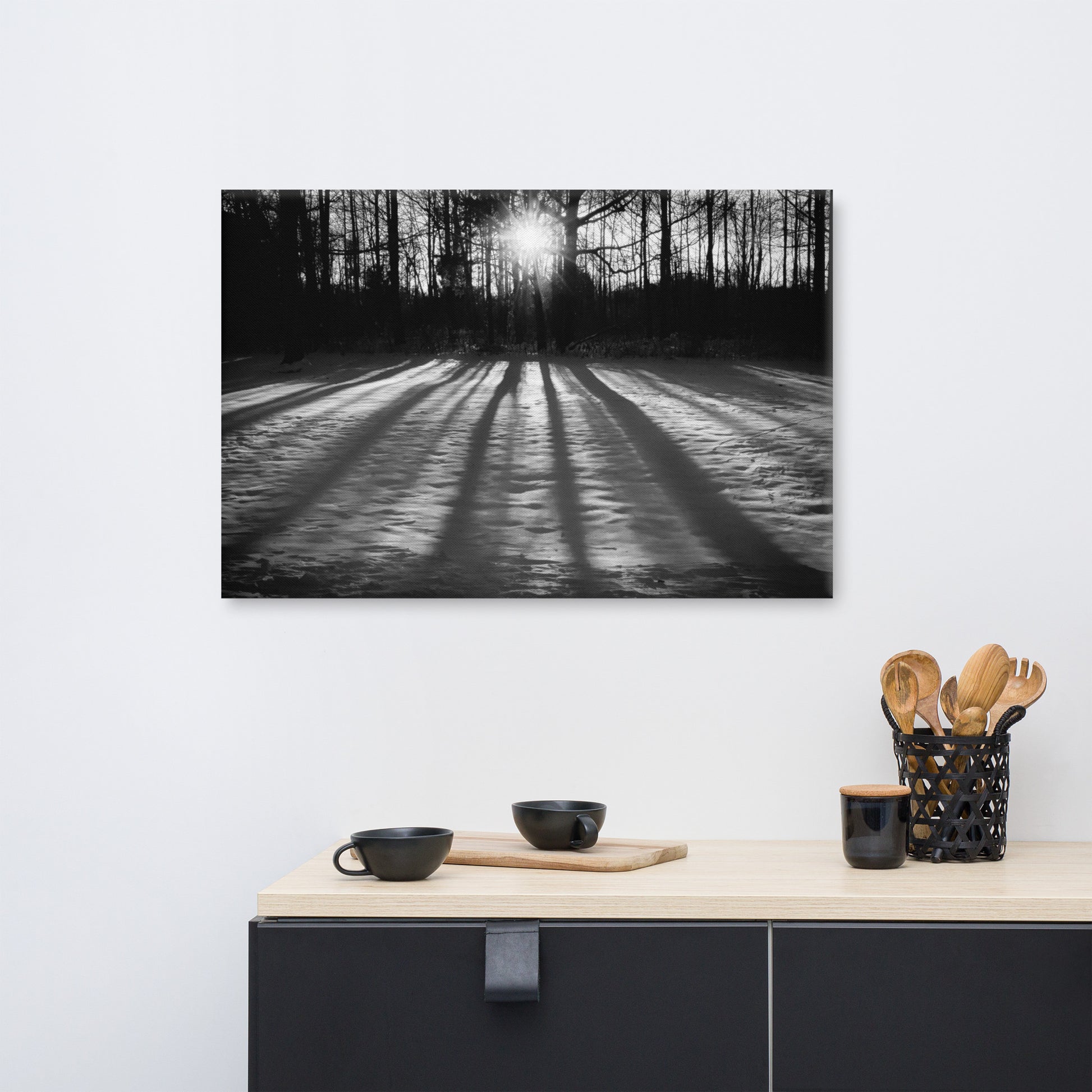 About this black and white rustic wall art: This striking black and white canvas print captures the ethereal beauty of a snow-covered forest bathed in the soft light of the setting sun. The bare branches of the trees cast long, dramatic shadows across the pristine snow, creating a mesmerizing interplay of light and darkness. The stark contrast and minimalist composition evoke a sense of tranquility and solitude, inviting you to pause and reflect.